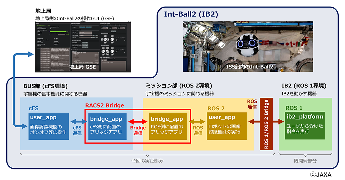 ISS内の「Int-Ball2」の技術実証プラットフォームにRACS2 Bridgeを搭載し、ROS2上で動作する物体認識AI「MobileNet」を利用して宇宙飛行士を「Person」、としてリアルタイムに識別しました。そのデータはcFS側へ送信され、ROS2ベースの高度なAI処理とcFSのリアルタイム制御が、軌道上環境でも正常に連携動作することを実証しました。
