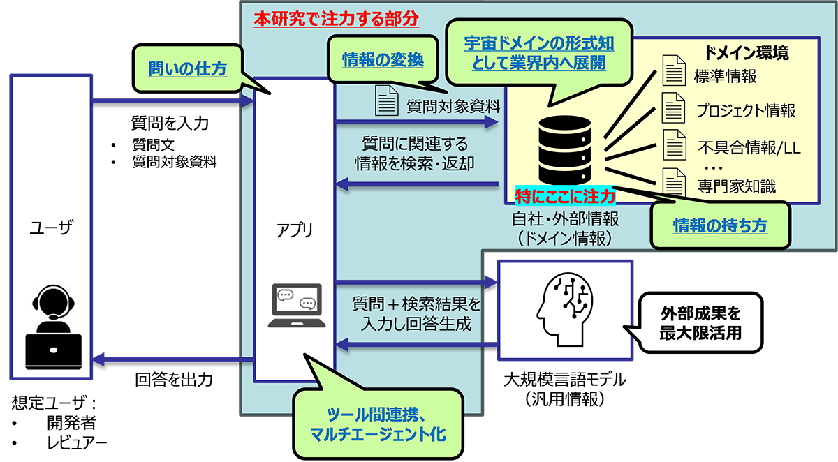 情報のセキュリティを確保しながら、生成AI等の技術を活用し、専門家の知識や過去の経験といった先人の知恵を形式知化するとともに、システム設計情報等から、ユーザの問いに対して的確に情報抽出し回答を可能とし、開発の効率性向上を可能とするプラットフォーム構築を進めています。